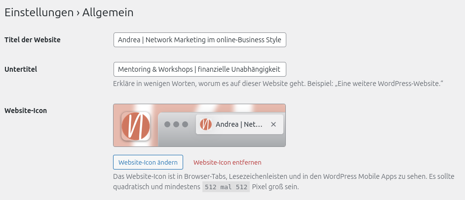- Unter Allgemein legst du ganz grundlegende Dinge fest: wie deine Webseite/dein Blog heißen soll (der Titel wird im Browserfester angezeigt), den Untertitel / den Claim (kannst du auch erstmal leer lassen), das Website-Icon, Datumsformat, … angezeigt werden soll
