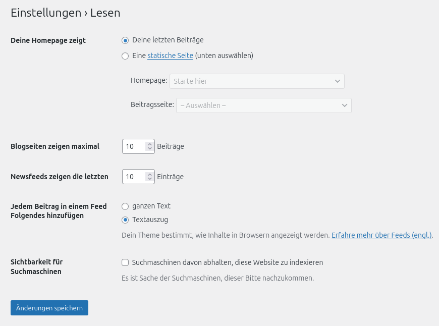 - Lesen: Für alle Neu-Bloggerinnen und Blog-Starterinnen bietet sich bei „Deine Homepage zeigt“ die Einstellung „Deine letzten Beiträge“ an. Auf deiner Blog-Startseite werden immer deine neuesten Blogartikel in chronologischer Reihenfolge angezeigt: Mit Überschrift, Beitragsbild und einem kurzen Textauszug.