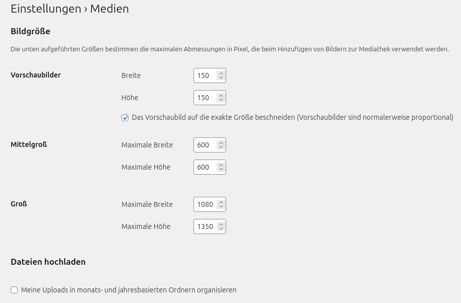 - Medien: Wenn du magst, kannst du diesen Punkt auch ignorieren, da die Grundeinstellungen für Blog-Starter schon optimal sind. Ich habe für mich ein paar Anpassungen für die Bilgrößen gemacht , die du auf dem Screenshot siehst. Achte bitte auch auf das „nicht vorhandene“ Häckchen unter „Dateien hochladen“.