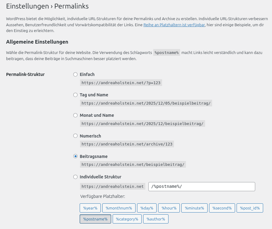 - Permalinks: Diesen Punkt solltest du unbedingt anpassen, bevor du deinen ersten Blogartikel schreibst. Wähle bei der „Permalink-Struktur“ unbedingt die Einstellung „Beitragsname“ aus. Der Vorteil ist, dass dein Blogartikel einen sogenannten „sprechenden Link“ hat, der aussagekräftig ist und dem Leser sofort erschließt, um welches Thema es in dem Blogartikel geht.