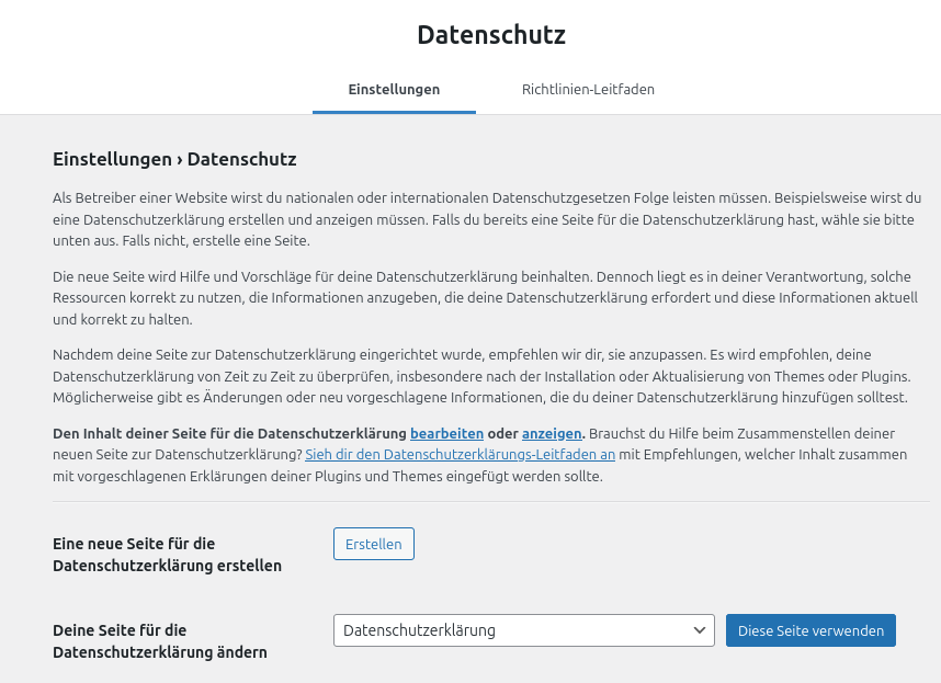 - Datenschutz: Solange du mit deinem Blog-Abenteuer noch am Anfang stehst und du noch kein Angebot auf deiner Webseite hast, kannst du den Standard-Datenschutz-Text von WordPress übernehmen. Klicke dazu bei „Eine neue Seite für die Datenschutzerklärung erstellen“ auf „Erstellen“ und ändere diese Texte so ab, dass sie für dich passen. Alternativ kannst du einen Datenschutzgenerator (z.B. auf eRecht24) nutzen, dir eine DSGV-konforme Datenschutzerklärung erstellen und sie als eine WordPress-Seite „Datenschutzerklärung“ erstellen. So siehen die Einstellungen bei mir aus: